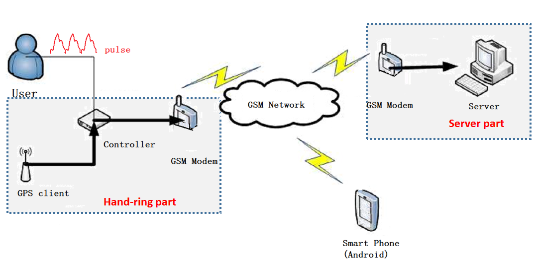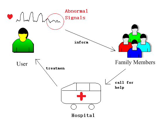 The system had three parts: a handring, an App of smart cellphone and a server. The handring was put on the wrist of the users. The apps were installed by the users family memebers, monitering the health status of the users. The servers received the information from the handring and handout to the apps. The procedures are as follows.