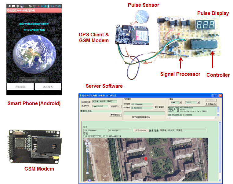 At the top right corner, a circuit model of the hand-ring part is displayed, including a pulse sensor, a GPS client, a GSM modem, the controller and etc. Below is the server’s main page, showing the map of the location and the emerrgency messages. At the top left corner, the Android app is displayed.